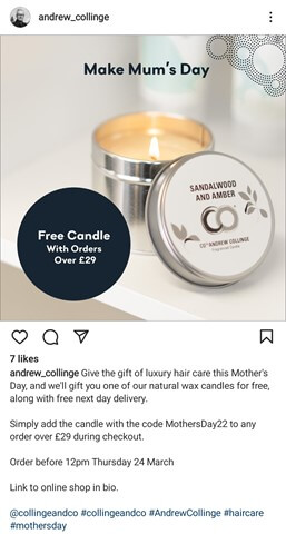 Encourage guests to spend a little extra with each order by offering a reward over a certain purchase amount. UK-based Andrew Collinge offered a free candle for sales over a set amount – which may be just enough to inspire one more item for purchase and result in a great little revenue boost.