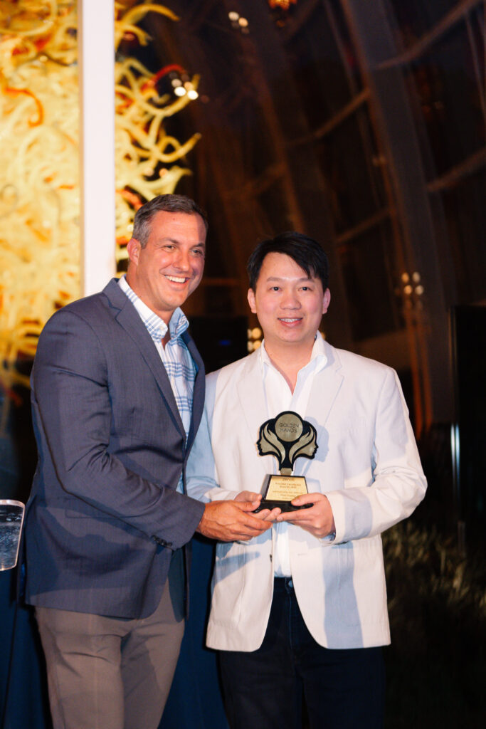 Zenoti’s chief customer officer Steve Hudek with nail stylist of the year, Tien Truong
