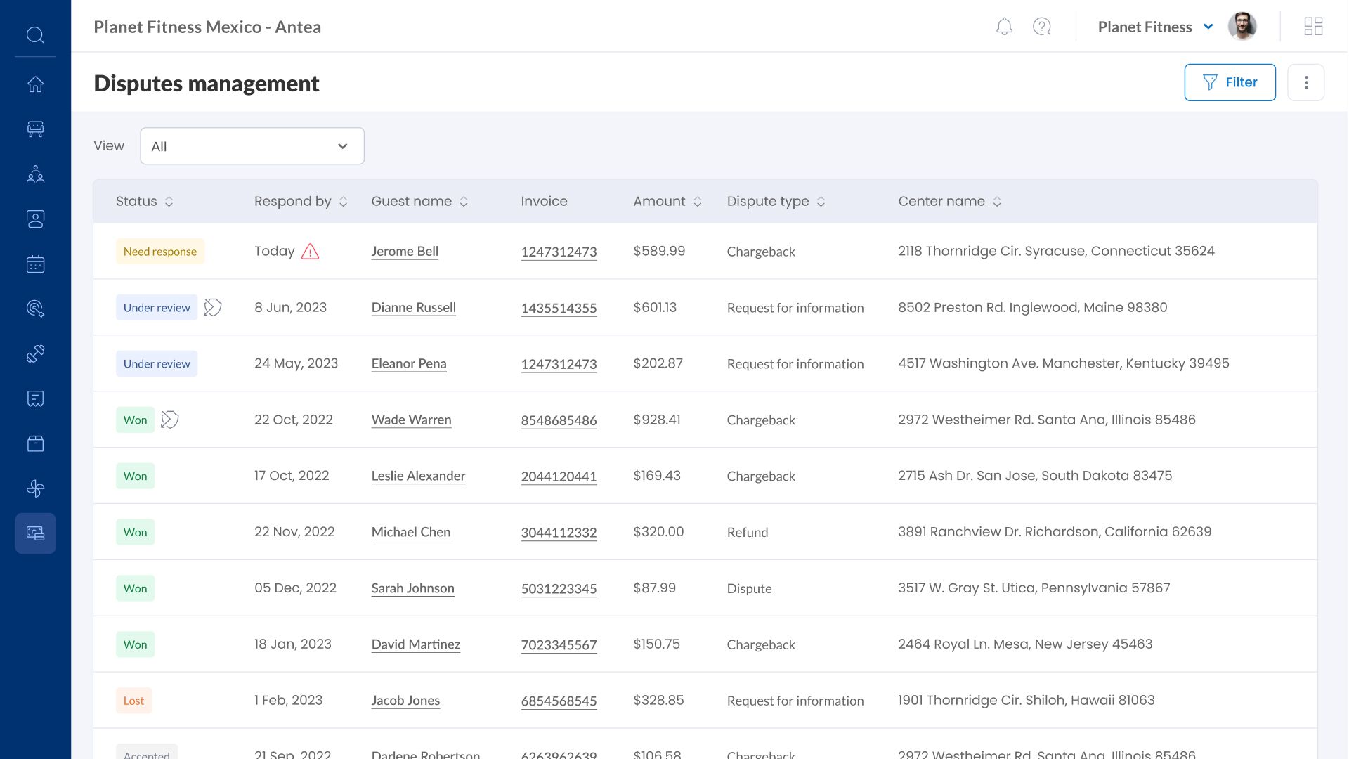 Realiza un seguimiento de todas las devoluciones en un solo lugar. Consulta las tasas de éxito por centro, tipo y periodo de tiempo para detectar patrones y poner fin a la pérdida de ingresos.