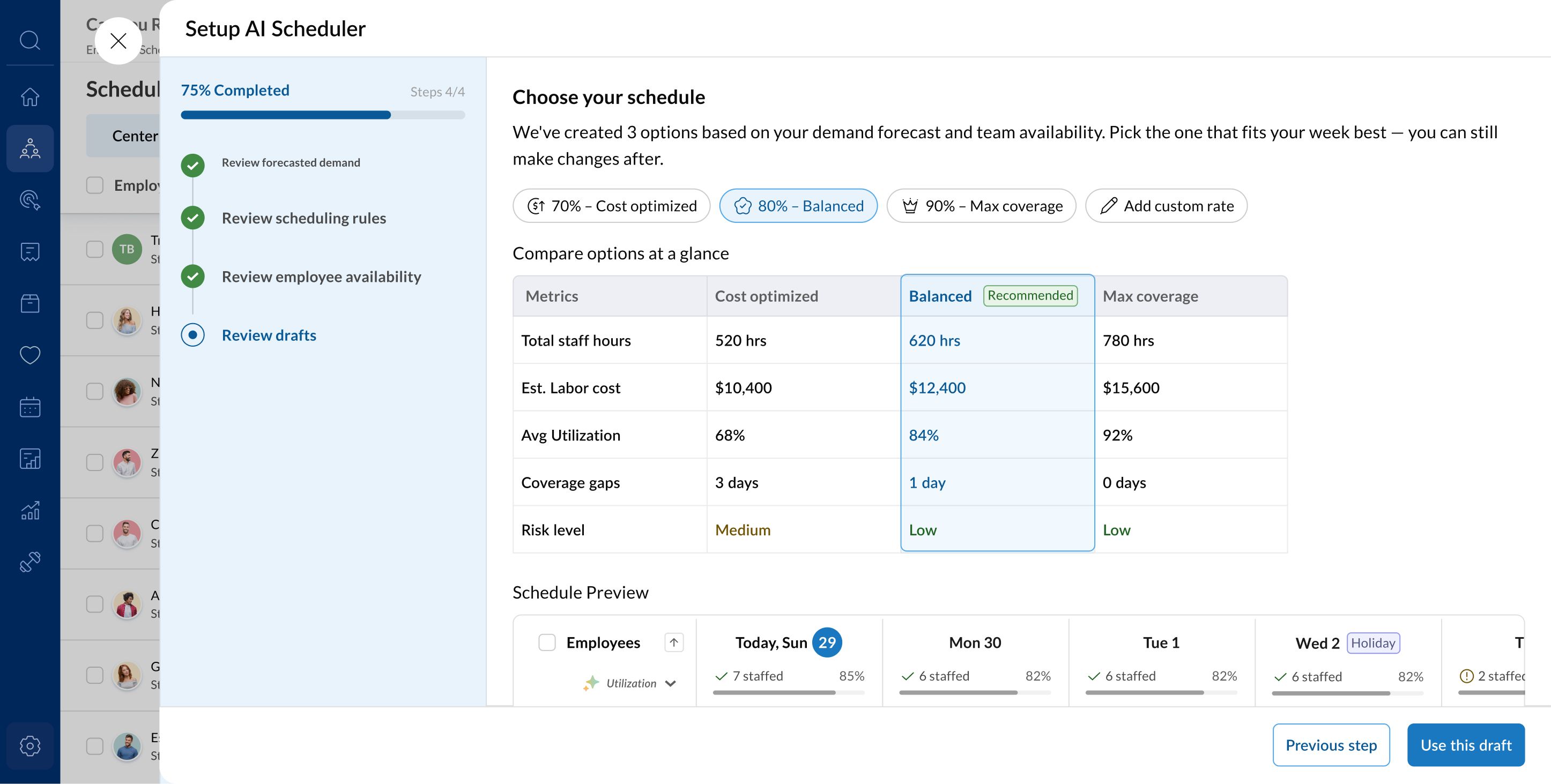 - Utilization targeting — Draft built to hit your defined utilization rate, with days that fall short flagged before the schedule begins
