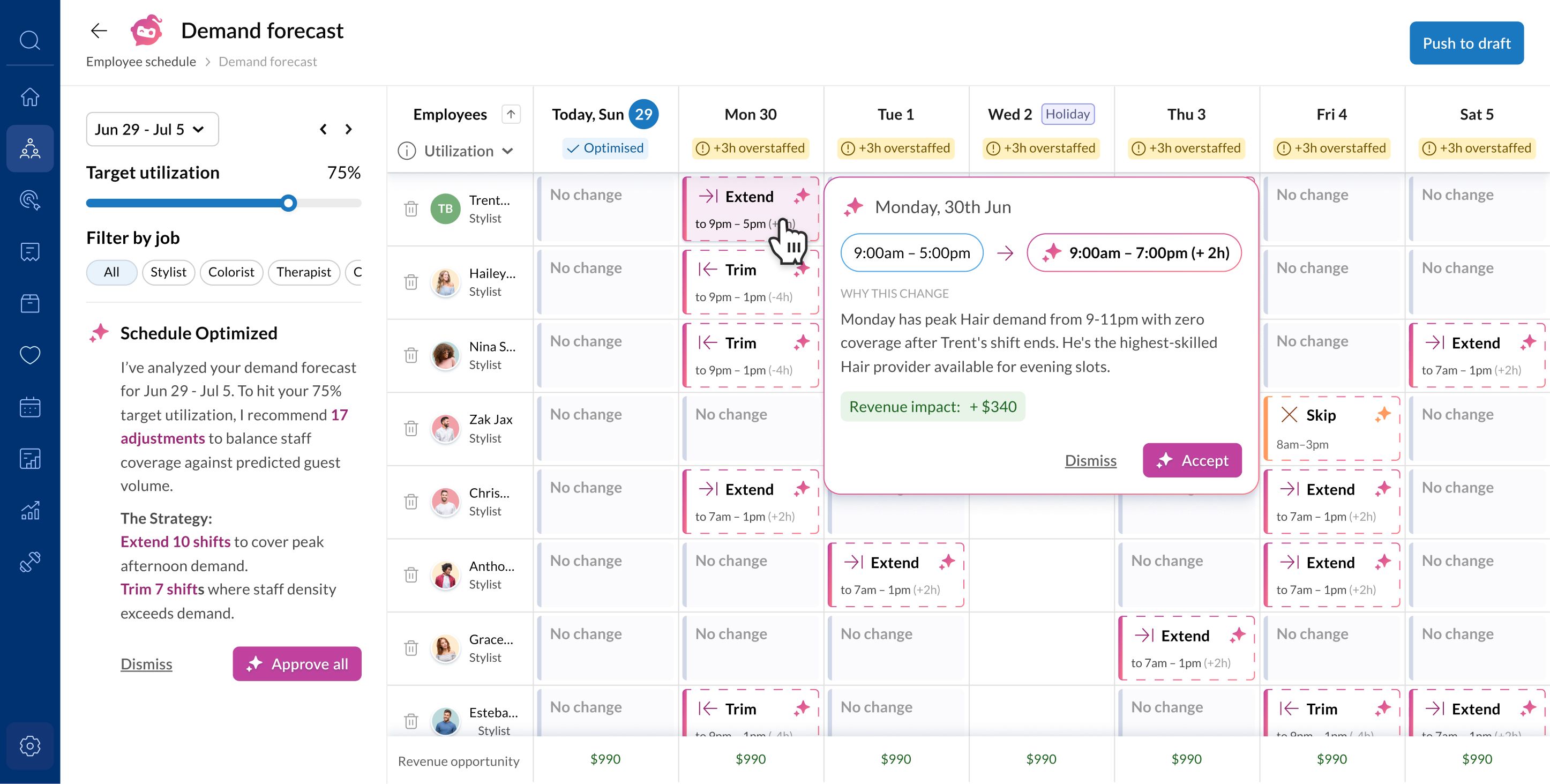 Zenoti takes the demand forecast and turns it into a draft roster: skills matched to forecasted service mix, availability respected, utilization target built in. Every shift decision comes with the reasoning behind it. Managers review, adjust if needed, and publish in one motion inside Zenoti.
