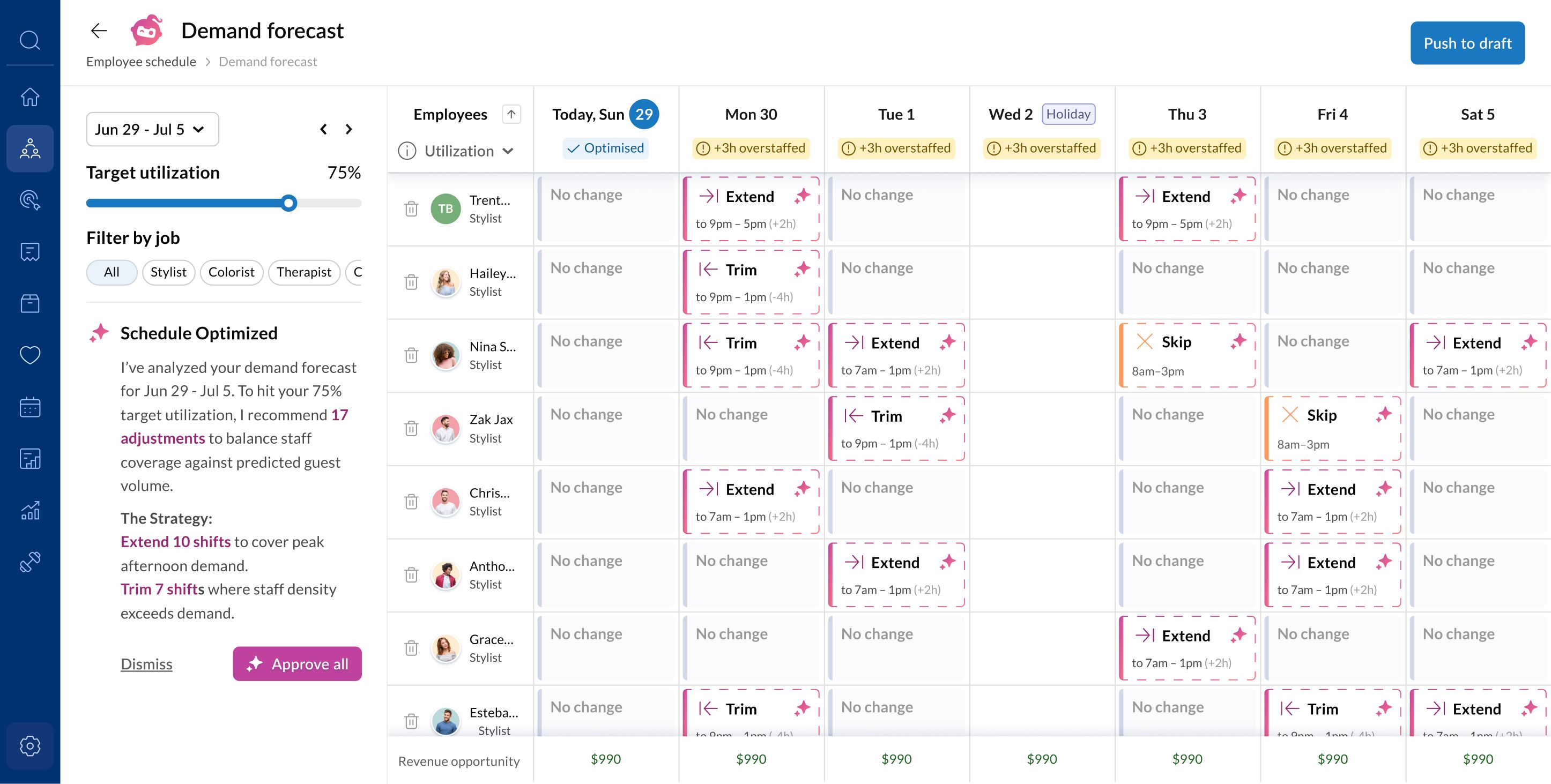 When predicted utilization falls below target, the scheduler flags the gap while there is still time to fill it. A staffing forecast becomes a demand signal. A slow day becomes a campaign. Not a loss reconciled after the fact. (Coming Soon)