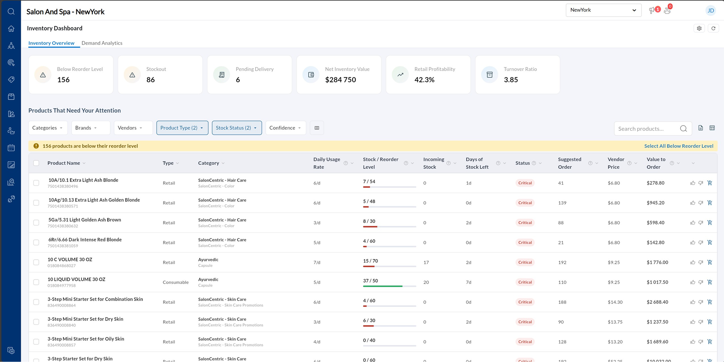 AI Inventory Manager runs continuously in the background, reads your appointment book and consumption patterns, and surfaces exactly what to reorder, when, and how much. No reports to pull. No guesswork.