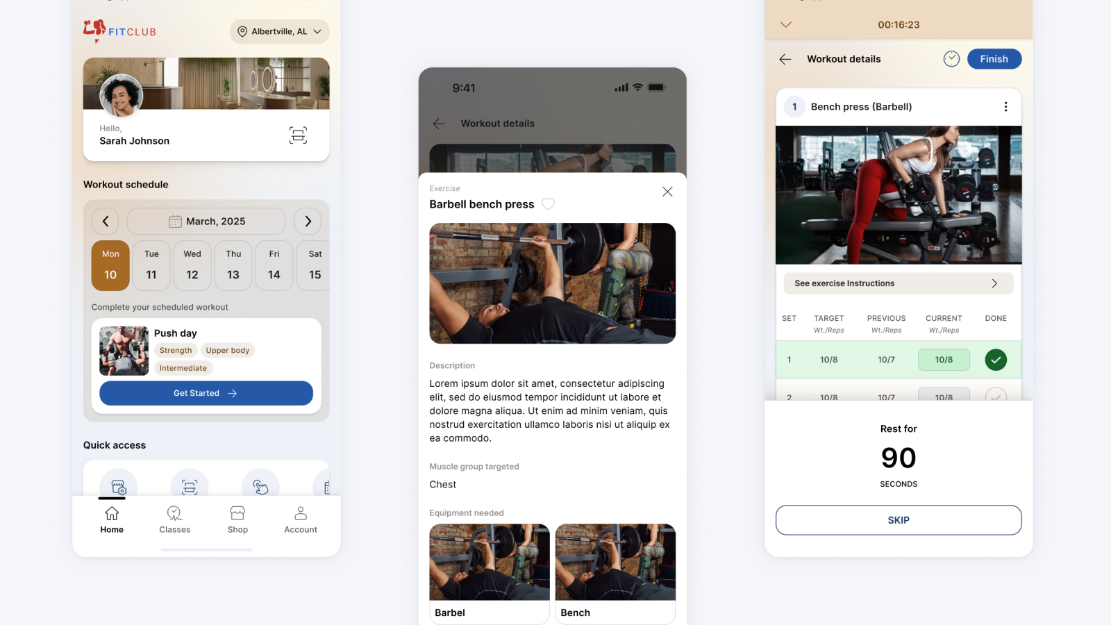 - Auto-play video guidance — Looping exercise video plays in the background for every movement so members never guess what to do