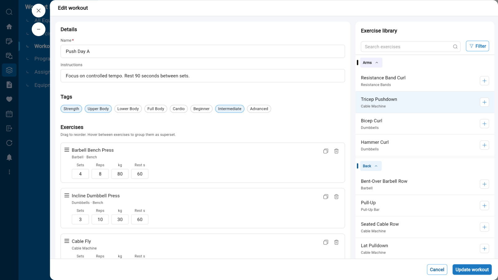 - AI-assisted program builder — Build and schedule multi-week programs with smart defaults so trainers spend less time on admin and more time coaching (Coming soon)