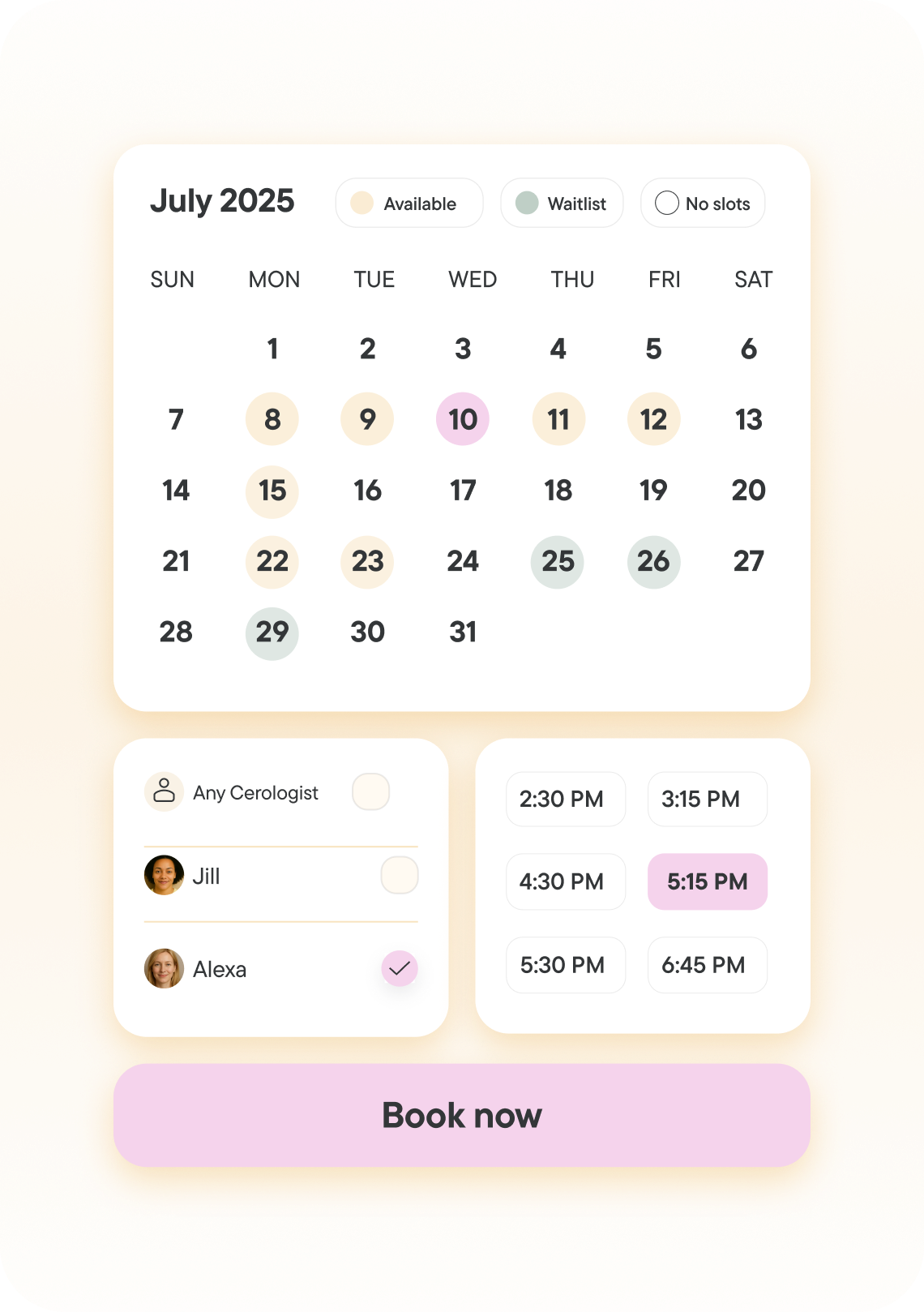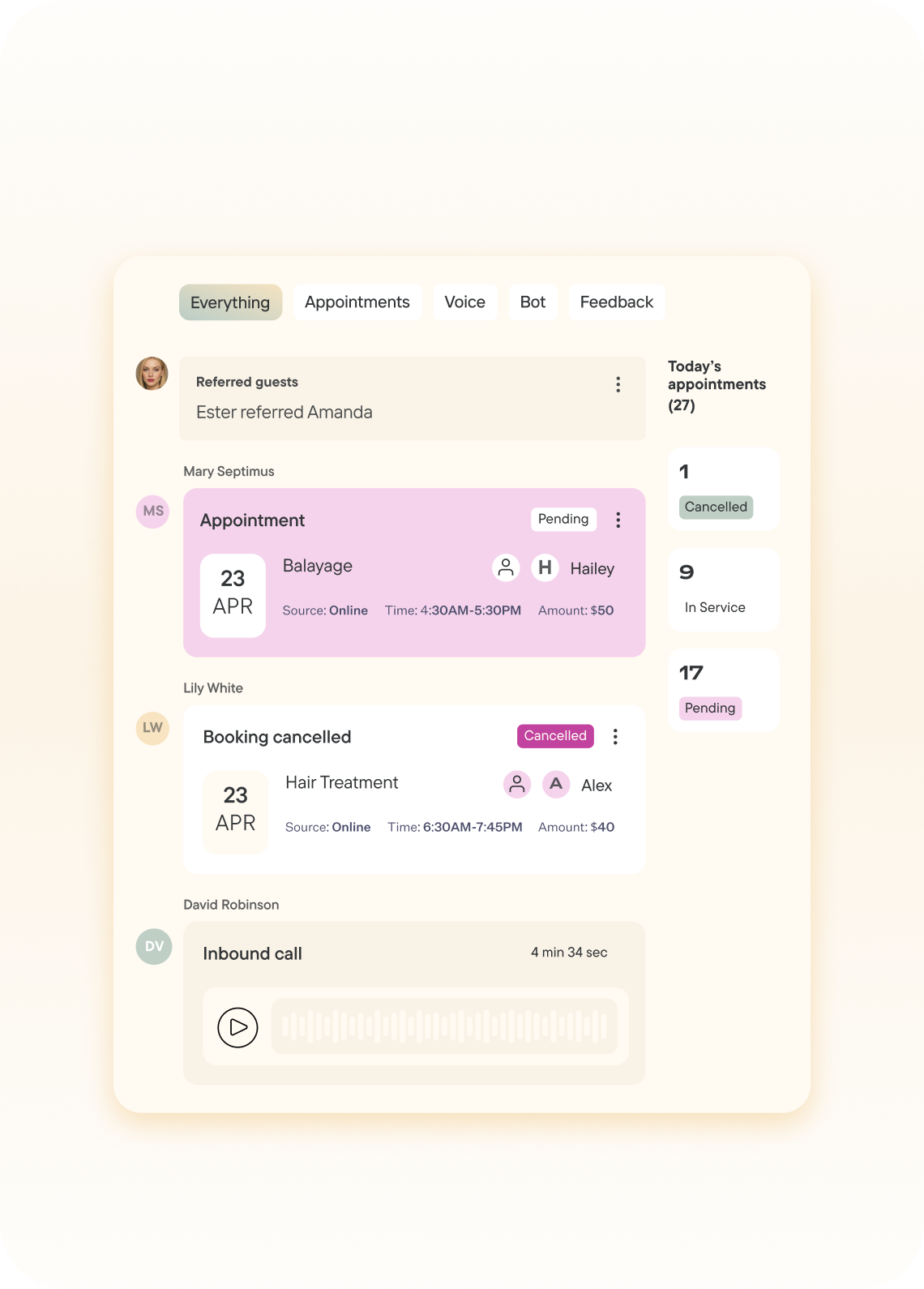 A unified calendar that syncs staff, rooms, and equipment in real time.