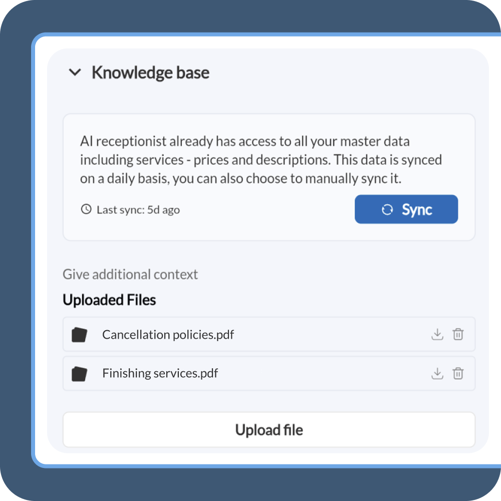 Whether it’s a new booking, a cancellation, or a service inquiry, the AI handles it live on the call based on real-time availability and makes automatic updates to the Appointment Book.