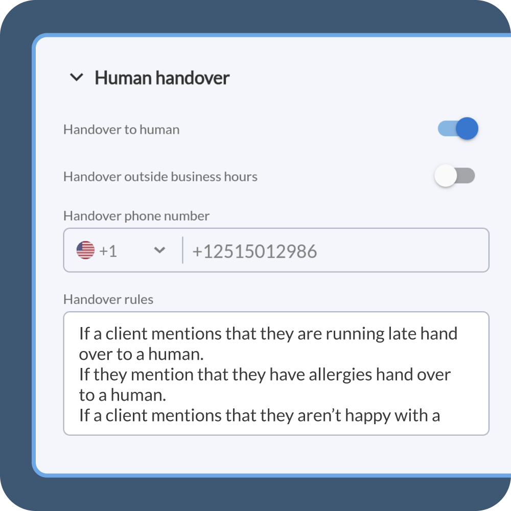 If the request requires a human touch, the AI passes the call to your team—seamlessly, along with full conversation context so your team picks up right where the AI left off.