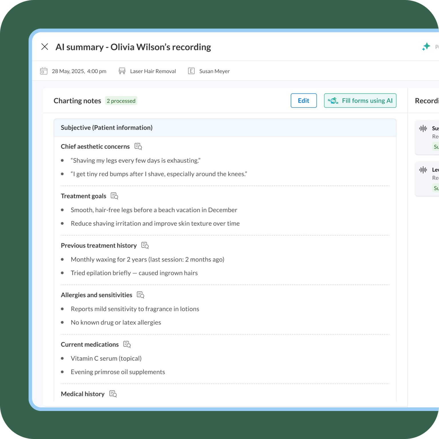 AI Scribe is optimized for aesthetics visits—injectables, consults, laser treatments, facials, and combination services. It understands aesthetics terminology and your custom Zenoti chart templates.