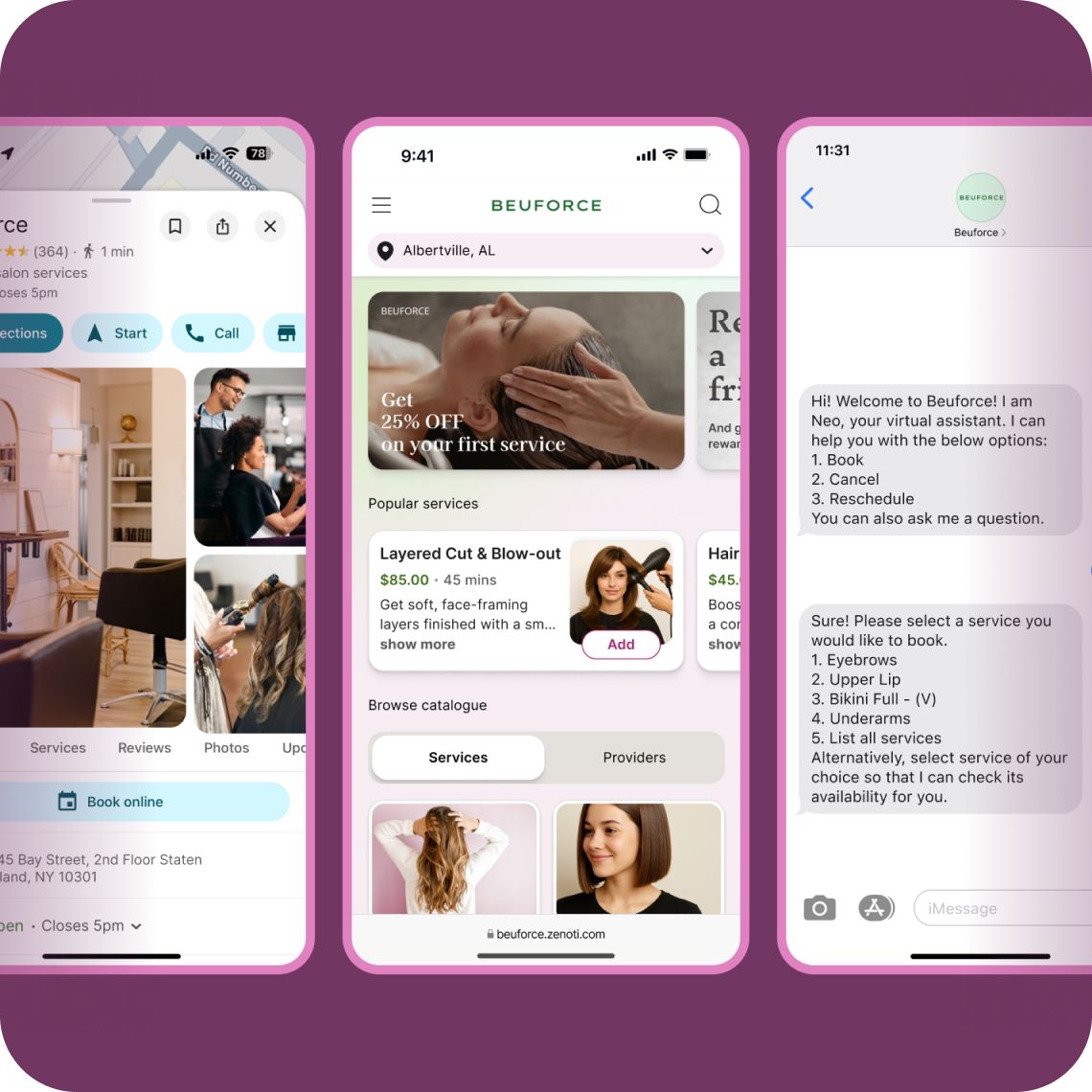 Guests can book through your Zenoti Webstore, branded mobile app, or SmartBot chat—even via Reserve with Google, Facebook or Instagram. Every flow is consistent, intuitive, and connected to your core calendar.