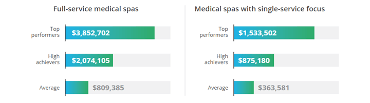Others in the beauty and wellness industry – such as stylists at beauty salons – employ a similar strategy. However, the gap between high performance and the average is greater across medical spa businesses.