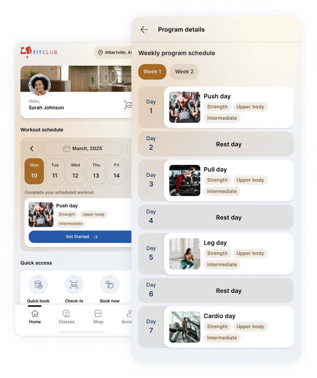 Class bookings, memberships, and workouts — all in one place. The more your app is part of a member's daily routine, the harder it is to leave. No competitor offers this combination natively.