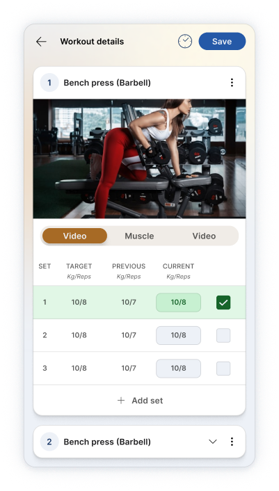 Members follow video-guided workouts and log sets in real time — one-tap set completion, auto-start rest timer, always visible on screen.